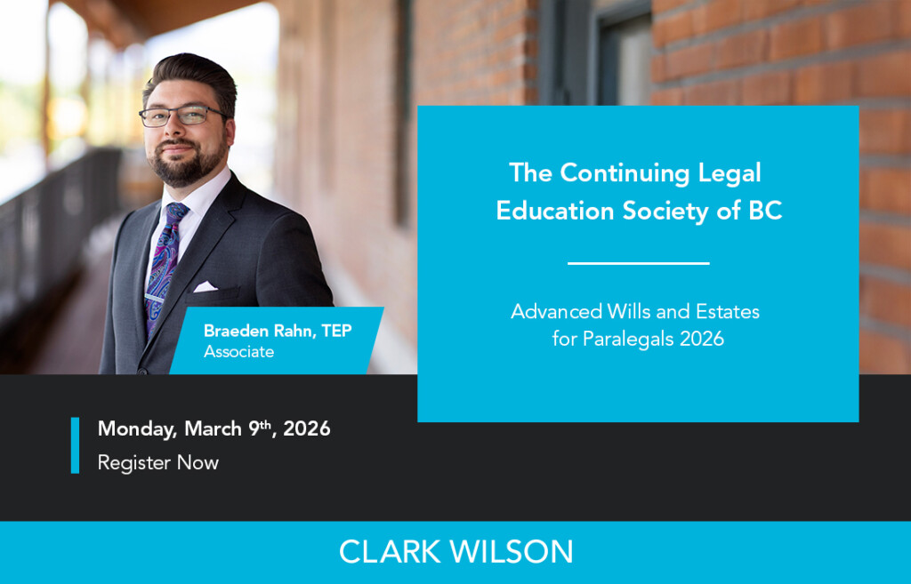 We are pleased to share Estates & Trusts associate Braeden Rahn, TEP will be presenting at the Continuing Legal Education Society of British Columbia (CLEBC) conference, “Advanced Wills and Estates for Paralegals 2026”, taking place on Monday, March 9th, 2026.