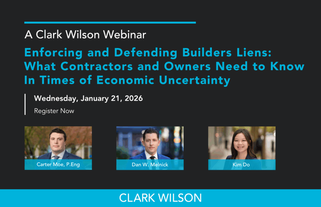 Join Clark Wilson LLP lawyers Carter Moe, Dan Melnick, and Kim Do for an in-depth webinar that breaks down the legal and practical essentials of the Builders Lien Act and how the new prompt payment regime will reshape payment practices and lien enforcement in British Columbia.