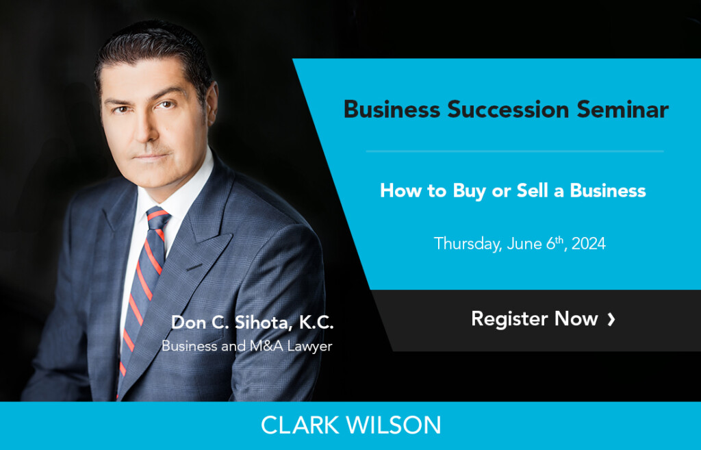 If so, you won’t want to miss Don C. Sihota, K.C.’s Business Succession Seminar on Thursday, June 6th, 2024. During the half-day seminar, you’ll benefit from Don’s 30+ years of experience as a mergers & acquisitions lawyer as he explains how to: