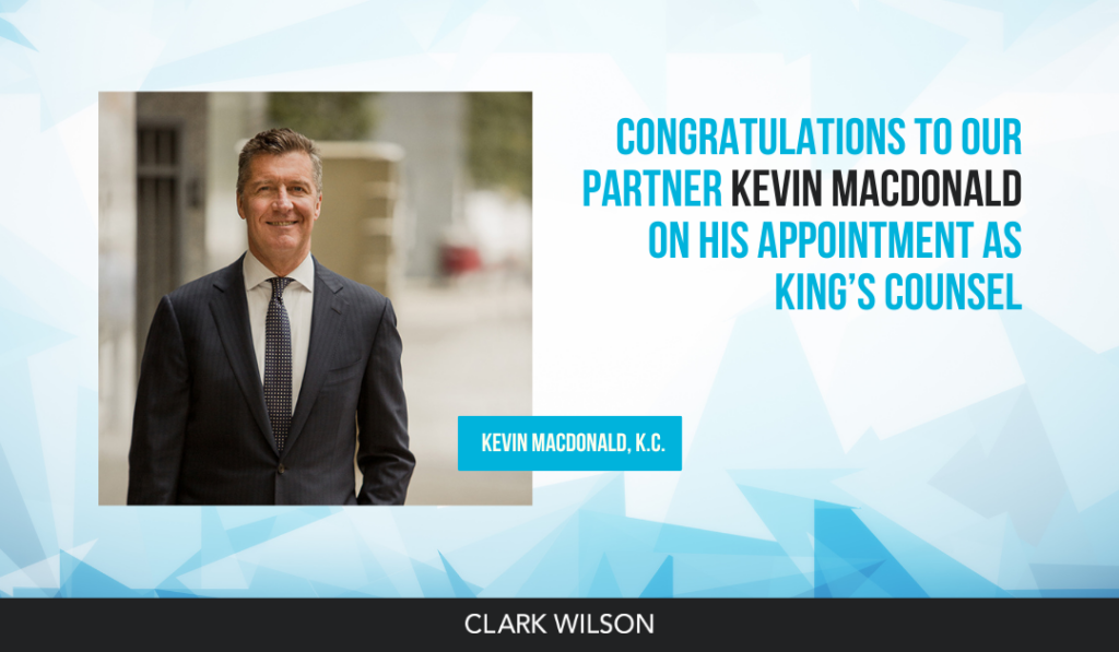 Clark Wilson is delighted to announce that senior partner Kevin MacDonald has been awarded King’s Counsel designation. This prestigious designation is a recognition of Kevin’s exceptional legal skills, dedication, and contributions to the legal profession.