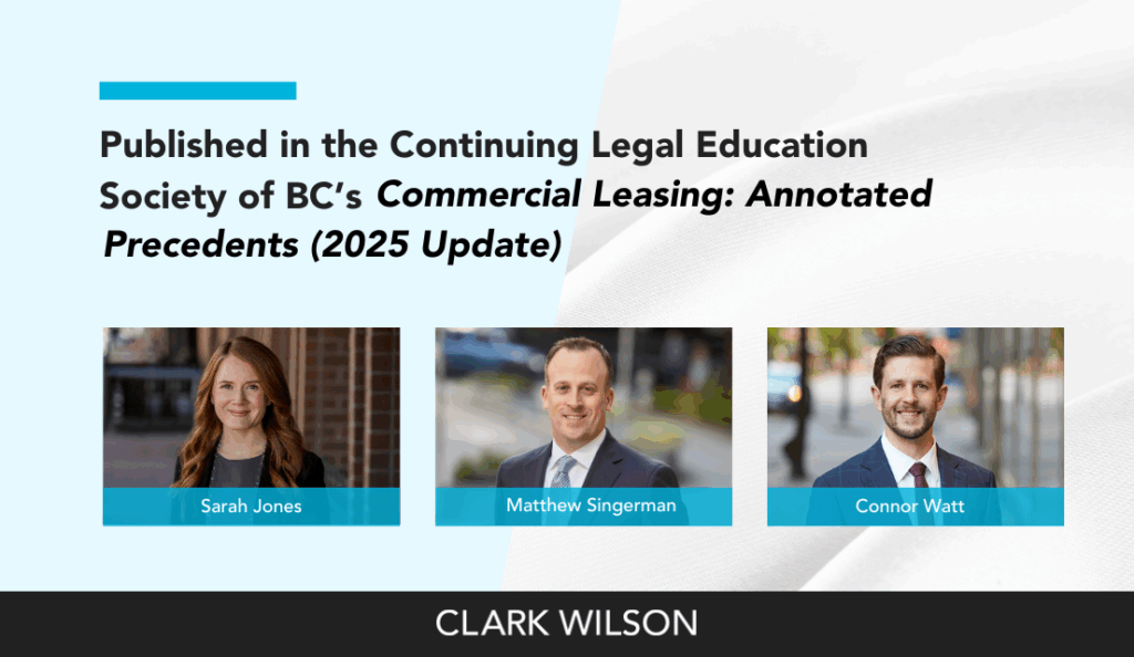 We’re pleased to share that the three members of Clark Wilson’s esteemed Commercial Real Estate practice, Sarah Jones, Matthew Singerman, and Connor Watt contributed to the latest edition of the Continuing Legal Education Society of British Columbia’s Commercial Leasing: Annotated Precedents (2025 Update), now available here.