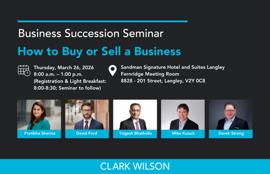 Join Clark Wilson LLP’s M&A lawyers Pratibha Sharma and David Ford for an informative half-day session, alongside leading M&A, finance, and tax experts: