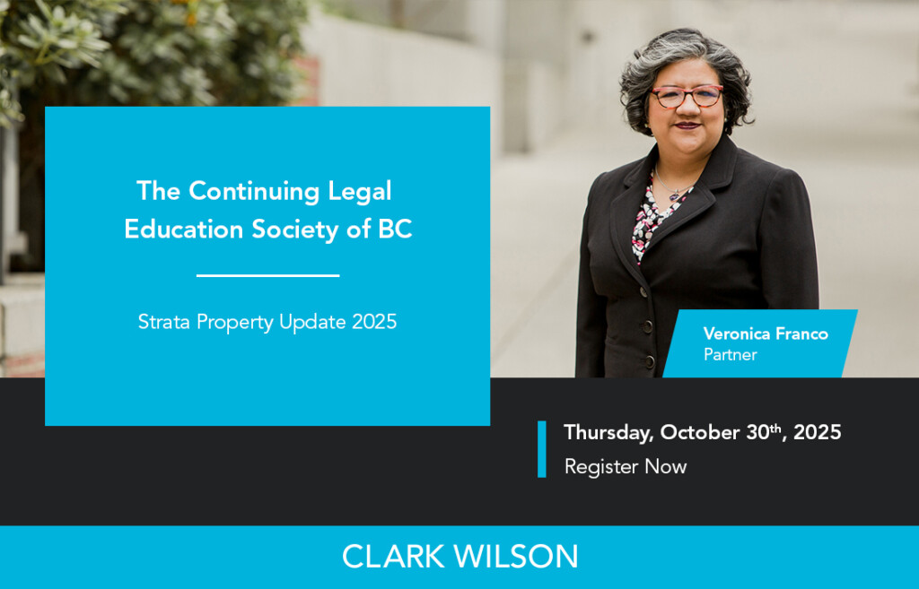 Join Strata Property co-chair and partner Veronica Franco as she presents at the Continuing Legal Education Society of BC’s “Strata Property Update 2025” conference on Thursday, October 30th.