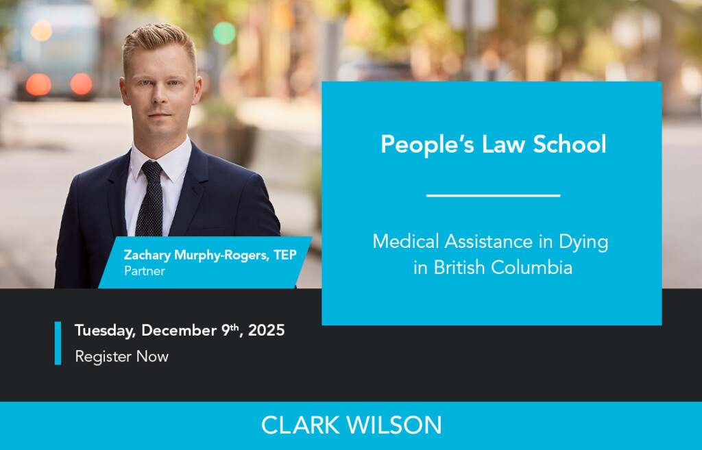 Join Estates & Trusts partner Zachary Murphy-Rogers, TEP as he presents at People’s Law School’s upcoming free webinar, “Medical Assistance in Dying in British Columbia” on Tuesday, December 9th.
